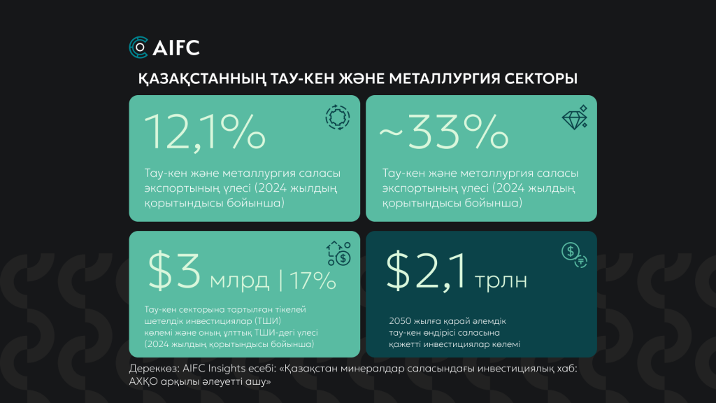 AIFC Insights-тың «Қазақстан минералдар саласындағы инвестициялық хаб: АХҚО арқылы әлеуетті ашу» атты есебіне сәйкес, Қазақстан зор ресурстық әлеуетке ие. 2024 жылы тау-кен секторы ЖІӨ-нің 12,1%-ын және елдің жалпы экспортының шамамен 33%-ын қамтамасыз етті. Елде мыс, алтын, хром, сирек жер металдары және басқа да пайдалы қазбалардың ірі қоры бар. Қазақстанға тартылған тікелей шетелдік инвестициялар (ТШИ) көлеміндегі металлургия мен тау-кен жобаларының үлесі 17%-ды ($3 млрд) құрайды, ал 2050 жылға қарай әлемдік тау-кен саласының капиталға деген қажеттілігі $2,1 трлн-ға жетпек.