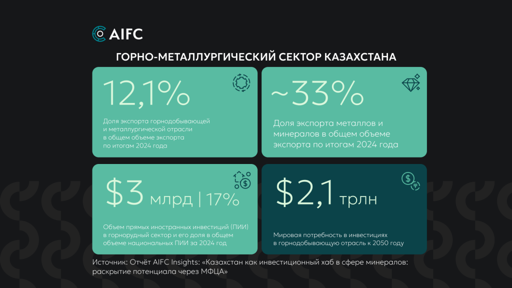 Согласно отчету AIFC Insights «Казахстан как инвестиционный хаб в сфере минералов: раскрытие потенциала через МФЦА», Казахстан обладает большим ресурсным потенциалом. За 2024 год горнорудный сектор обеспечил 12,1% ВВП и около 33% совокупного экспорта страны. В стране большие запасы меди, золота, хрома, редкоземельных металлов и др. Доля металлургии и горнорудных проектов в общем объеме прямых иностранных инвестиций (ПИИ) Казахстана составляет 17% ($3 млрд), тогда как мировая потребность в капитале для добывающей отрасли к 2050 году составит $2,1 трлн.